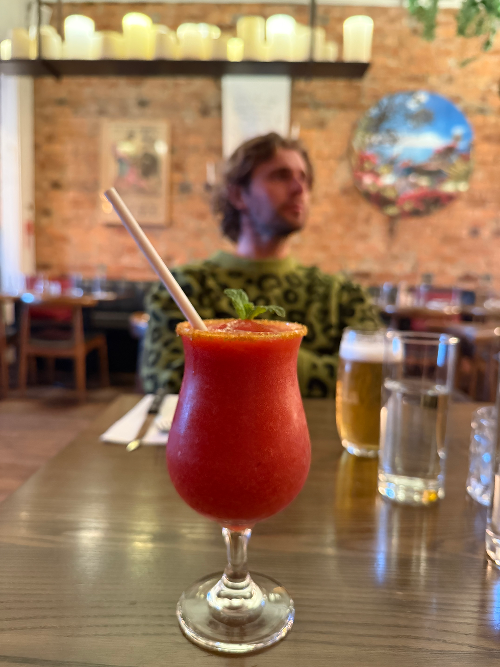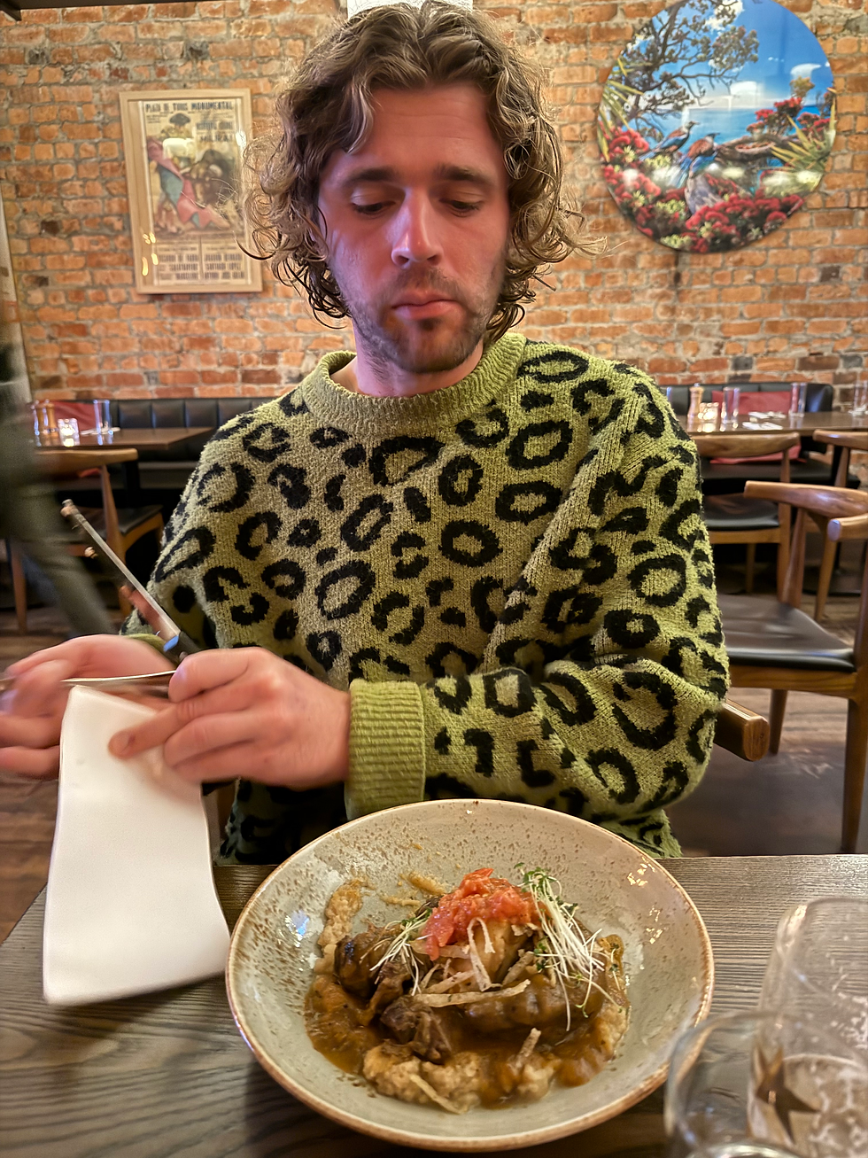 Thankfully our food hadn’t arrived so I hadn’t delayed our eating. It came a few minutes later and it was all delicious. They’d bought a steak knife for a morg but he didn’t need it the venison fell off the bone and I had a fork full of it and it melted on my tongue.